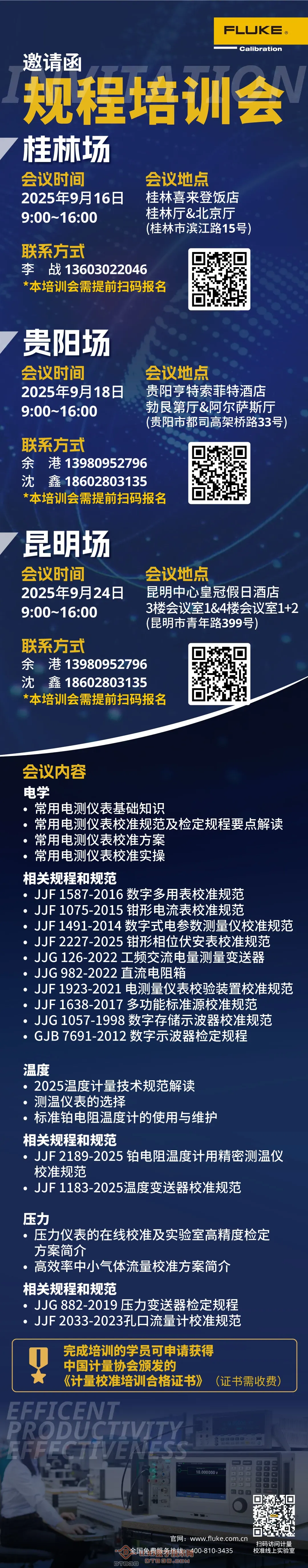 福禄克公司规程培训会邀请,培训会将在桂林/贵阳/昆明三个地方举办。